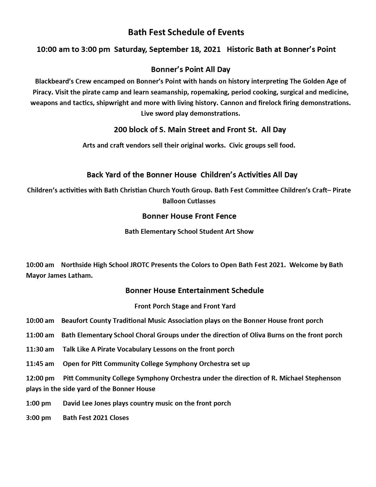 The Bath Fest Committee is working through the process to have Bath Fest 2021 on Sat. Sept. 21, 2021. The State of NC is still under COVID restrictions limiting both indoor and outdoor gatherings. This limits any kind of mid-May event. The Sept. 18th date works with Bath Fest’s pirate theme as we can incorporate Talk Like A Pirate Day activities.
