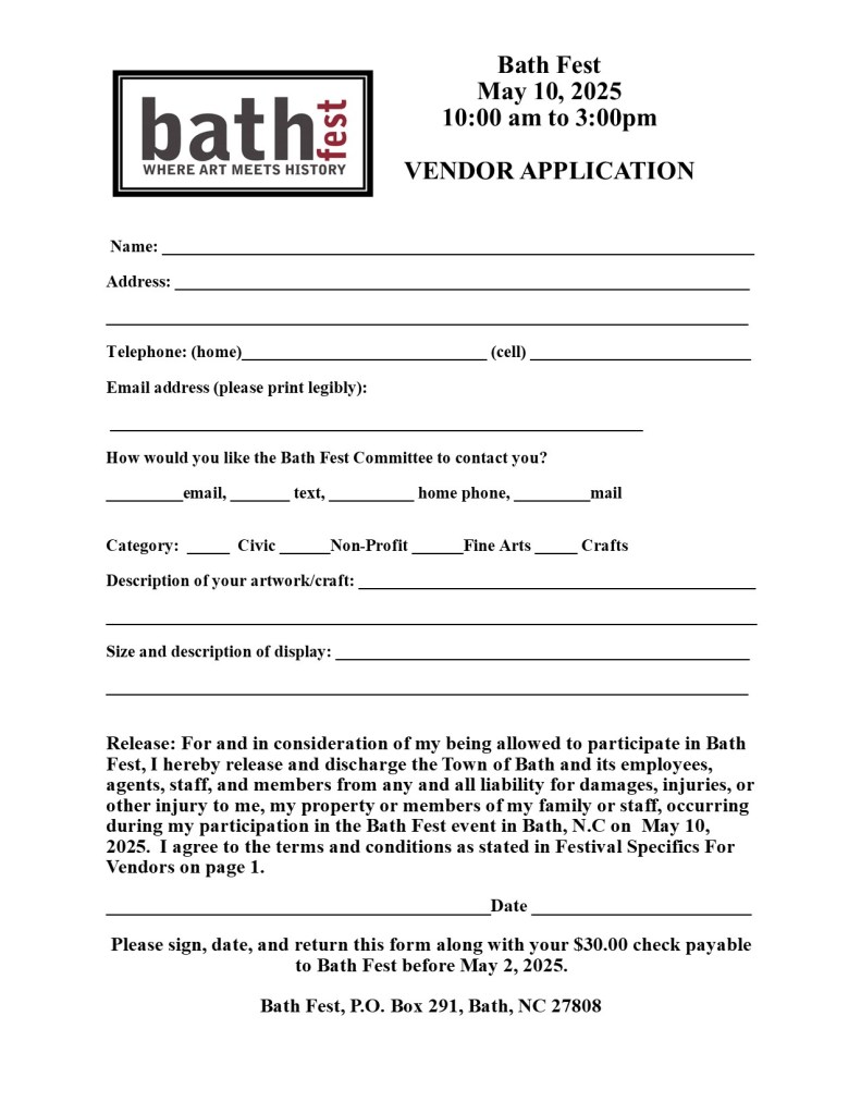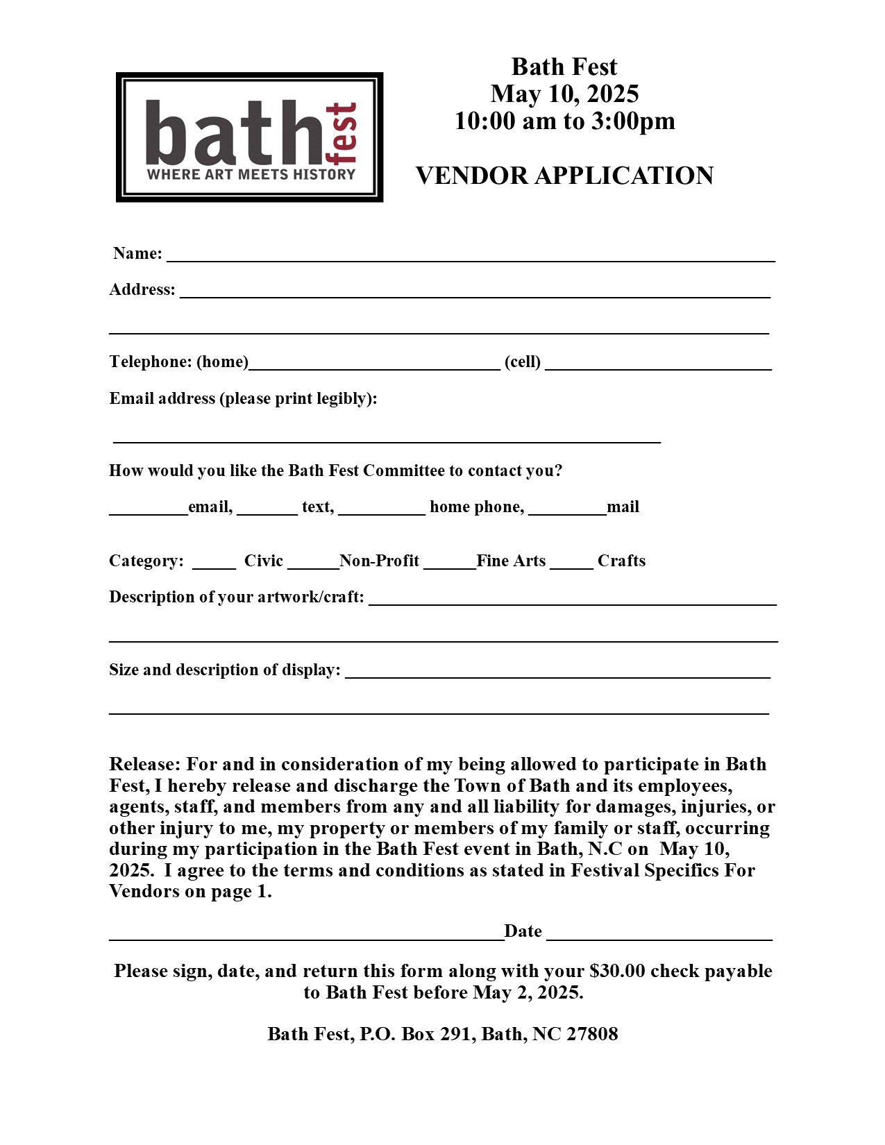 The Bath Fest Committee is planning for Bath Fest to be held on Saturday, May 10, 2025 from 10:00am to 3:00pm in Historic Bath at Bonner’s Point. Arts and craft vendors will sell their original works in a street fair around Bonner’s Point.